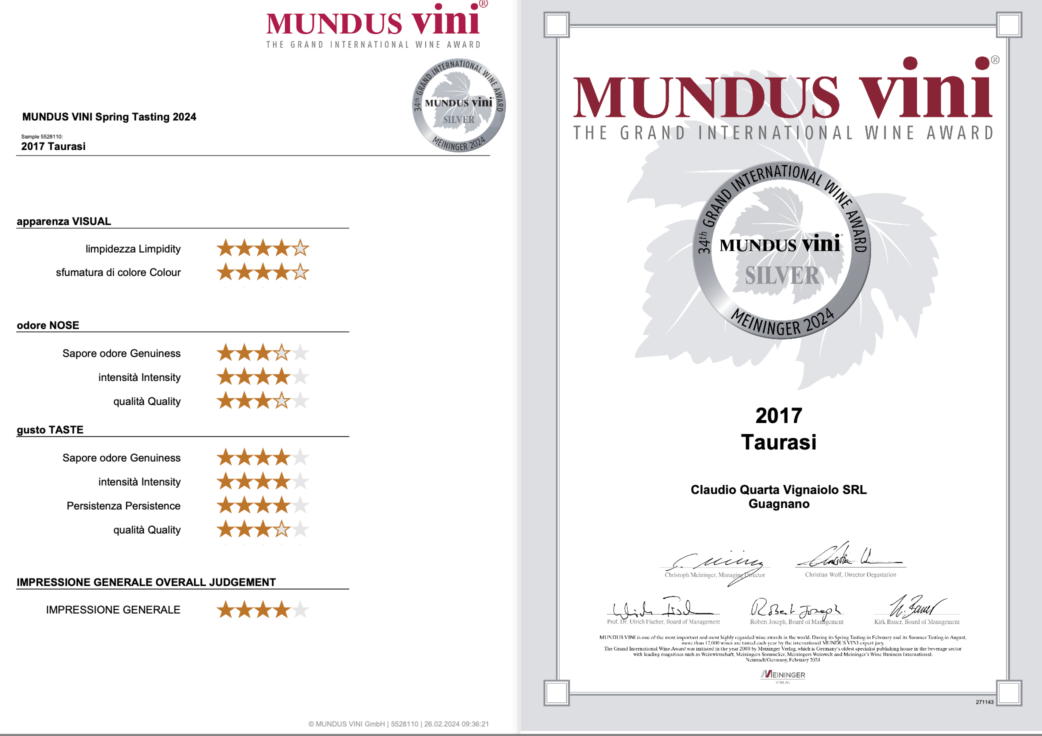 Our Taurasi 2017 has earned the well-deserved Silver Medal at Mundus Vini. Coming from the rich Campanian land, this wine embodies the elegance and strength of a region renowned for its centuries-old winemaking tradition.