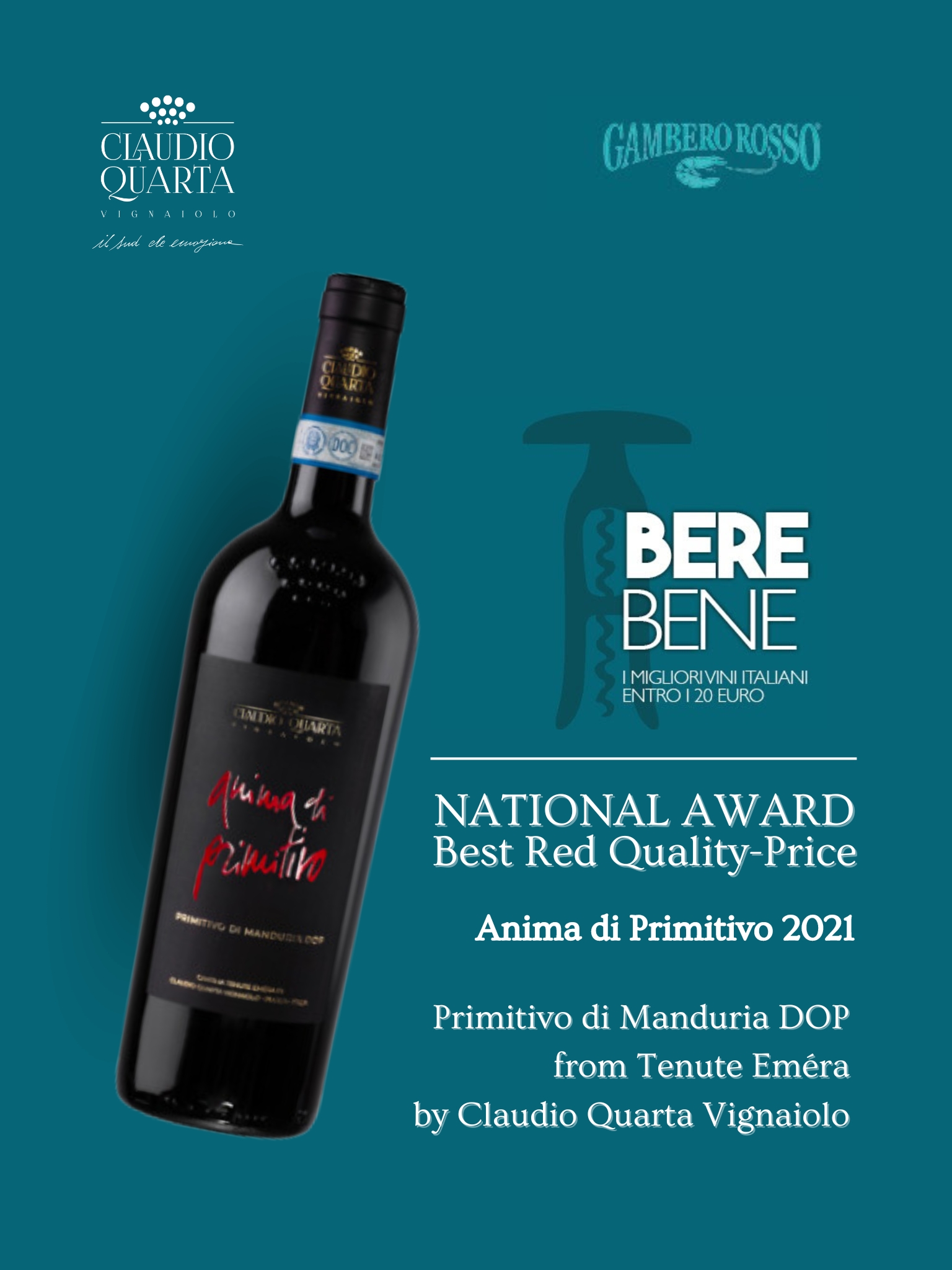 I often wonder how it is possible to rank first with so many and so different competitors. Winning the Gambero Rosso Three Glasses, which is a highly coveted award, is a recognition of quality that can be achieved by multiple wines. It is not a competition. But when in May Moros was defined as “Best red wine in Italy” at the World Competition in Brussels, and now that Anima di Primitivo was declared “the best red” by Gambero Rosso for the quality/price ratio, it surprises me how come first among many high quality and low cost wines in Italy.