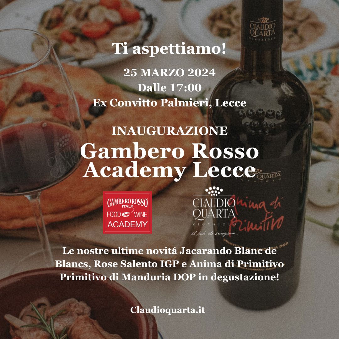 I nostri grandi vini saranno protagonisti di un esclusivo wine tasting in occasione dell'inaugurazione di Gambero Rosso Academy a Lecce, il prossimo 25 marzo 2024. Dalle ore 17:00 presso il suggestivo chiostro del Cinquecento del Convitto Palmieri, gli amanti del vino avranno l'opportunità di degustare alcune delle più pregiate etichette dell'azienda pugliese.